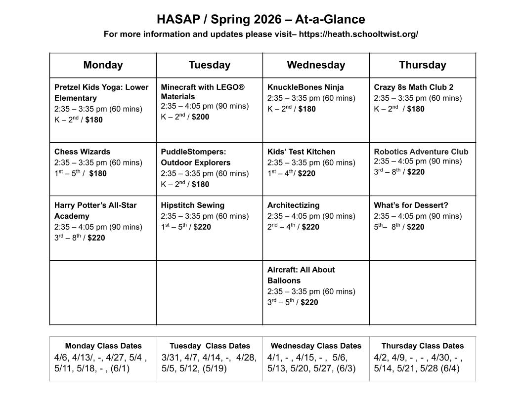 Please email the HASAP Team with any questions at: heathafterschoolactivities@gmail.com